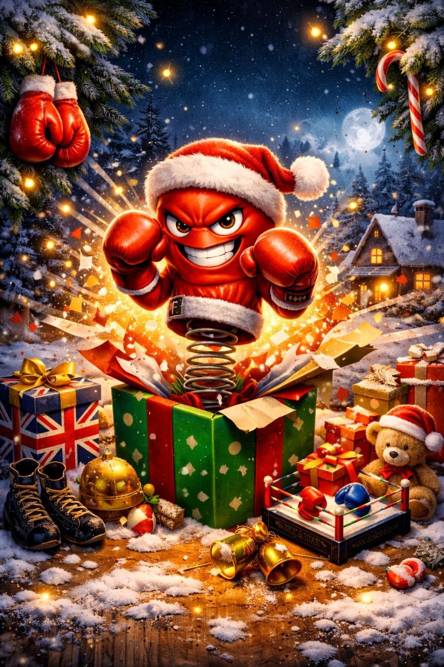Inspired by the concept of post-holiday energy and anticipation, the image blends winter holiday symbolism with kinetic motion. The boxing-glove character represents readiness, strength, and optimism, while the gift box and seasonal setting evoke surprise, celebration, and transition.