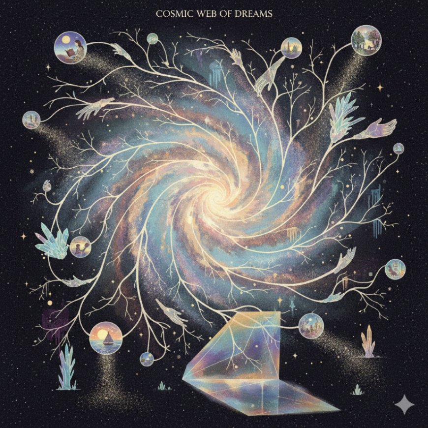 The Prism/Crystal: At the bottom, the geometric shape represents logic and structure, acting as a foundation or a lens through which we interpret these ethereal dreams.